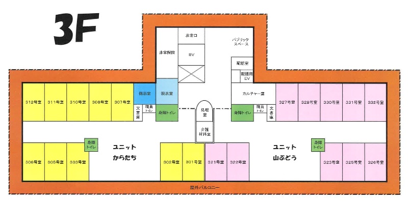 ◎3階も20室(からたち10室、山ぶどう10室)のご入居用のフロアとなっております。眺めもよくバルコニーにて散歩や日光浴等のんびりした日々をお過ごしいただけます。
